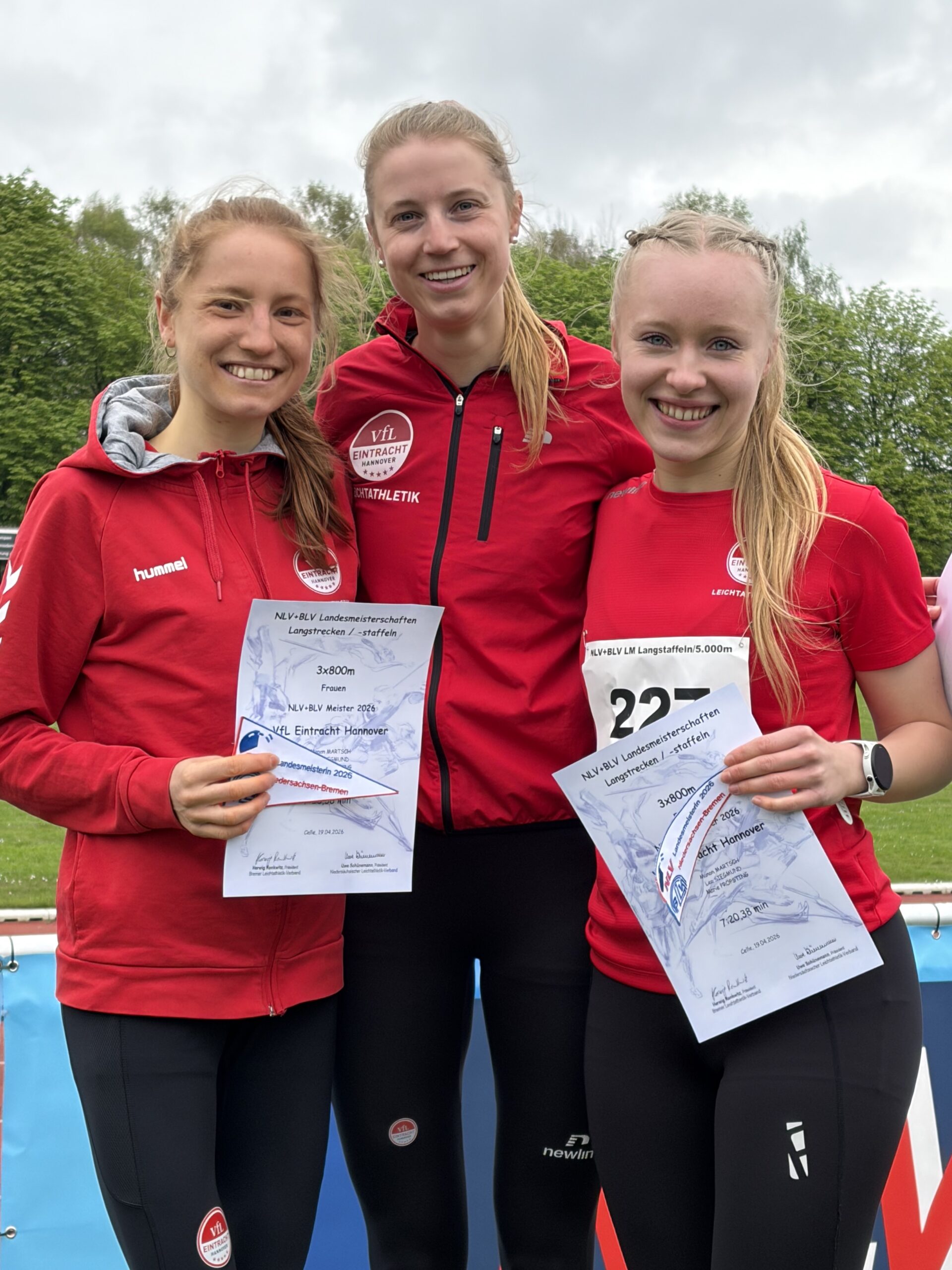 Über 3×800 m gin­gen Manon Martsch, Lea Sieg­mund und Marie Pröps­ting ohne spe­zi­fi­sche Vor­be­rei­tung an den Start – noch eine Woche zuvor waren Manon Martsch und Marie Pröps­ting 10 km beim Han­no­ver Mara­thon gelau­fen. Da die Kon­kur­renz über­schau­bar war, reich­te die End­zeit von 7:20,38 min für die drei Ath­le­tin­nen aus, um den Titel nach Han­no­ver zu holen.