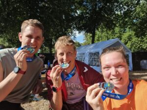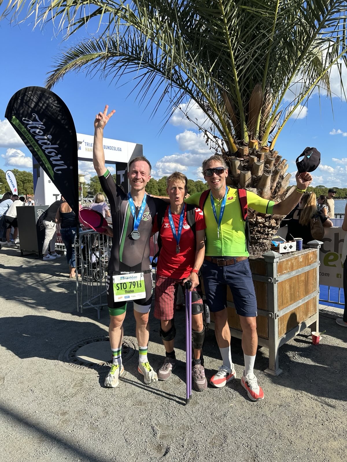 Das ‘Team Inklusion’ mit Tina (Para Swim 1,9km), York Weinem (Bike 90km) und Christian Kossenjans (Run 20km) konnte bei der Mitteldistanz-Staffel den Titel von 2024 verteidigen. Dabei lief es bei den einzelnen Disziplinen nicht ganz rund. Tina hat beim Schwimmstart ein Bein heftig gegen Kopf bekommen, York hatte eine kleine Panne auf der Radstrecke und Christian wurde auf der ersten Laufrunde zunächst fehlgeleitet. Trotzdem siegte das inklusive Staffelteam mit einem großen Vorsprung von fast 24 Minuten vor dem zweitplatzierten Team ‘Hannover 96 Triathlon’.