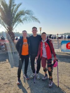 Oliver Marquardt (Duisburger Schwimmverein 98) musste dort beim Schwimmen bei seinem Landesligastart aussteigen (DNF). Tinas Plan war in einer inklusiven Staffel auf der Kurzdistanz zu starten. Leider war ihr Staffelpartner Timur Oruz (u.a. Hockey-Welmeister 2023 und ihr Laudator bei der Gala zur Behindertensportlerwahl 2023 in Nds.) kurzfristig erkrankt. Der hilfsbereite Event-Sprecher des Veranstalters TriFUN Kleve sagte mehrmals durch, dass noch ein Radfahrer für eine Staffel gesucht werde. Zufällig auch in dem Augenblick als Oli etwas frustriert von seiner abgebrochenen Schwimmstrecke in die Wechselzone zurückkam. Mit Bock doch noch aufs Rad zu können, meldete er sofort sein Interesse und zögerte auch überhaupt nicht, als er sah, dass seine Staffelpartnerin eine Paratriathletin ist. Ohne jegliche Berührungsängste trafen die Beiden ein paar Absprachen bzgl. benötigter Hilfe beim Wassereinstieg und ‑ausstieg und dem Transport der Orthesen und Gehstöcke und dann ging der Wettkampf auch schon los. Nach den 1500m Paraschwimmen für Tina im herrlichen Wisseler See ging es für Oli auf die schnelle 38km Radstrecke. Auf der abschließenden 10km Laufstrecke, für Tina im Rennrolli, hatte sie dann wie die Läufer*innen sehr mit der Mittagshitze zu tun. Aber als Oli Tina im Rolli dann auf der Ziellinie mit ihren Stöcken und Orthesen in der Hand laufend begleitete, war (auch nach Meinung der Zuschauer*innen) der inklusive Triathlontag perfekt (zweitschnellste Staffelzeit: 2:22:32h).